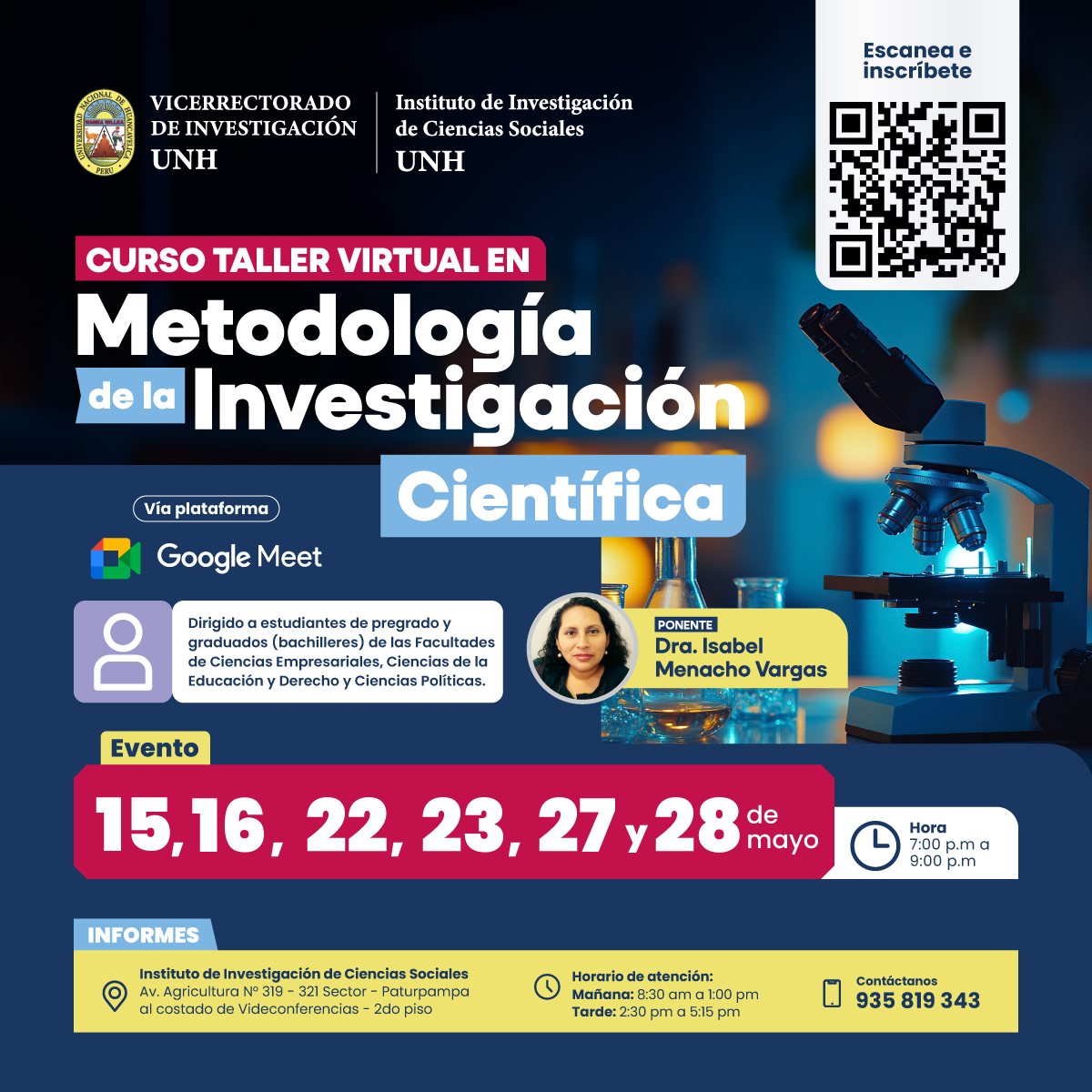 El Vicerrectorado de Investigación es un órgano de alta dirección, responsable del desarrollo de la investigación científica, tecnológica y humanística a nivel de pregrado y posgrado en la UNH.